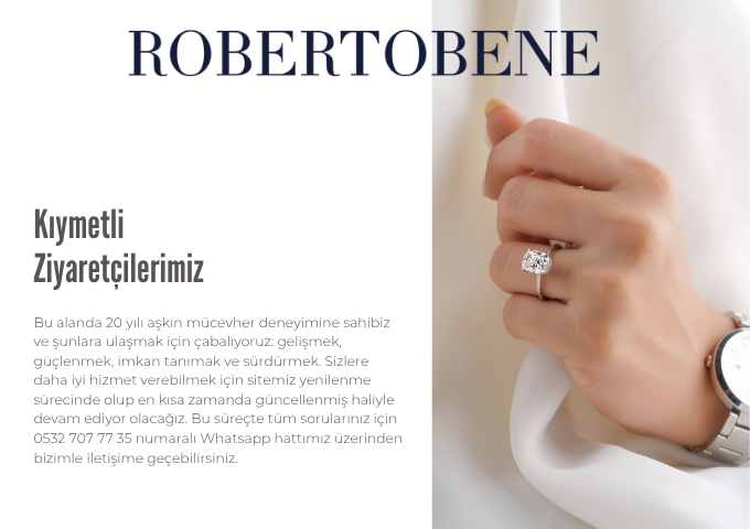 Roberto Bene Pırlanta’nın temelleri 2000’li yıllarda atılmış olup, sonrasında mağazacılık dışında robertopirlanta.com adresi altında Elektronik Ticaret sitesi ile de online olarak Türkiye’nin her noktasında hizmet vermektedir. Veritabanında on binlerce kayıtlı müşteriye sahiptir. Ürünleri sadece Online değil Mağazamızda da görebilirsiniz. Buyurun gelin ve her türlü sorunuzu sorun, öğrenin ve ona göre karar verin. Pırlantaları sadece yüzük üstünde değil, yüzüğe takılmamış haliyle de gerçek renklerinde görün.